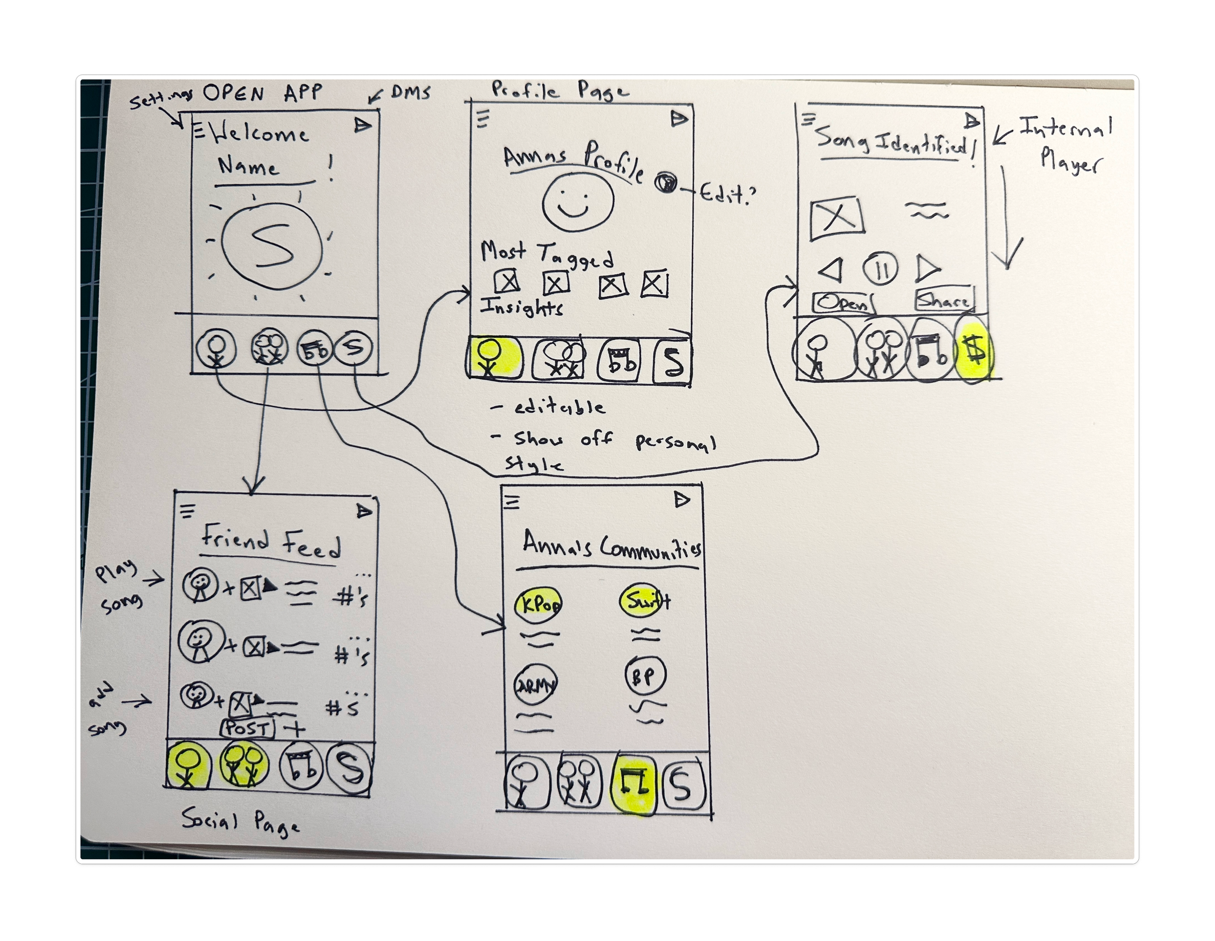 We ran two rounds of usability testing with tasks like finding a friend’s Shazam, exploring insights, and discovering a new playlist.