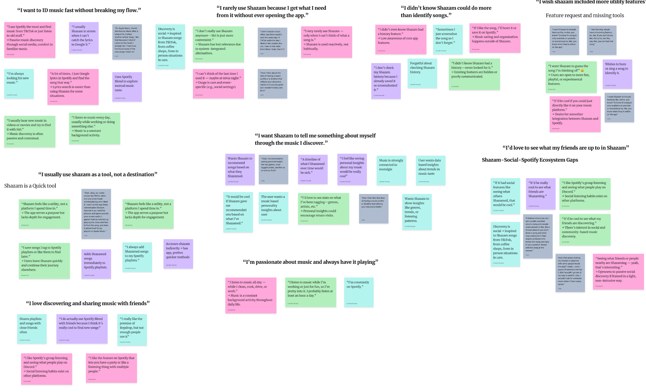 We conducted user interviews, affinity mapping, competitive analysis, and usability testing of the current Shazam app. Our research revealed a consistent theme: Shazam solved the immediate problem of identifying songs but failed to deliver on long-term engagement.
