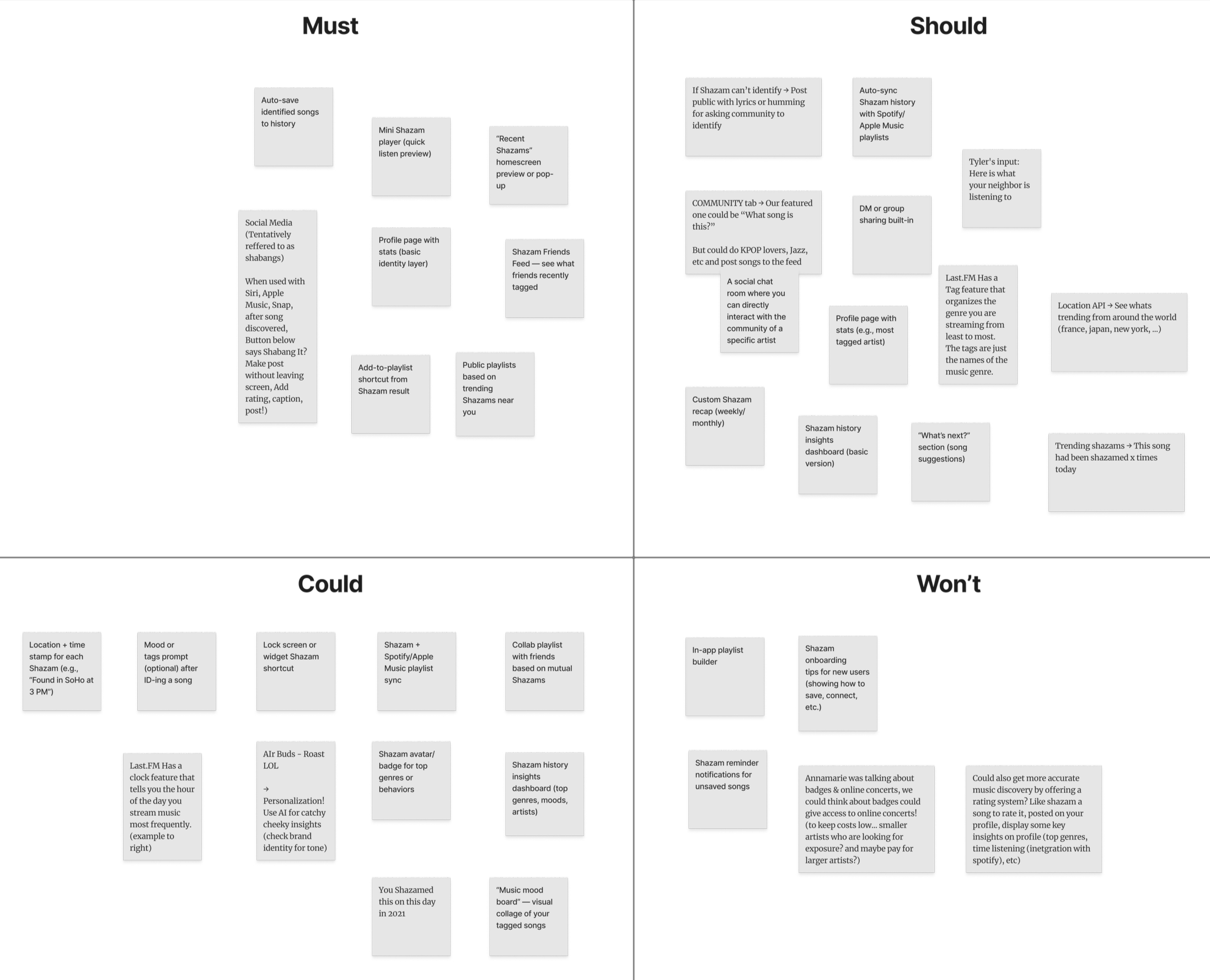 Organized ideas using a MoSCoW matrix (Must, Should, Could, Won’t) to identify which features would have the most impact.