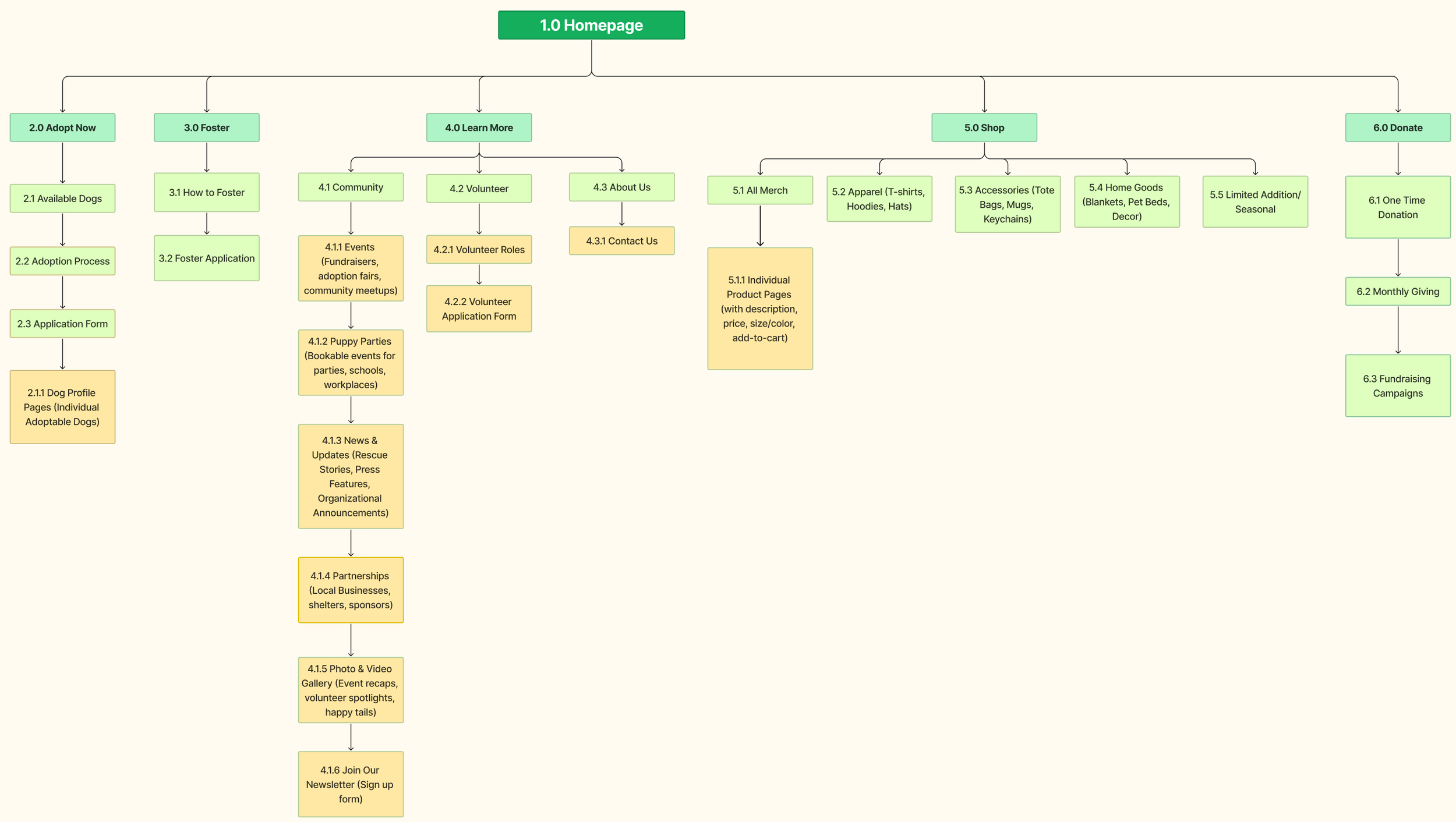 The revised sitemap organizes The Animal Pad website into clear, user-friendly sections Adopt, Foster, Learn More, Shop, and Donate each with streamlined subpages for easier navigation.