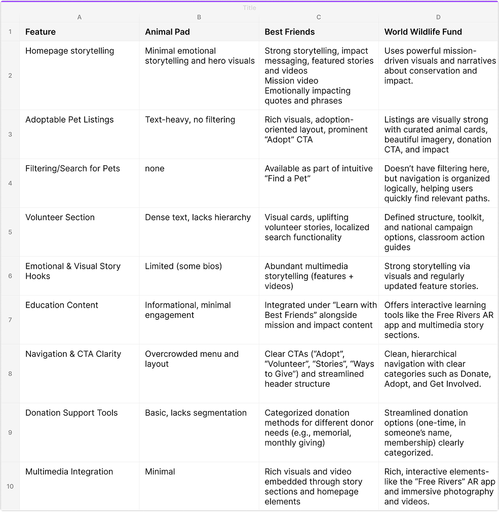Goal: The goal of the user journey map was to visualize the end-to-end experience, highlight pain points, and uncover opportunities to improve the adoption, fostering, and donation flows.