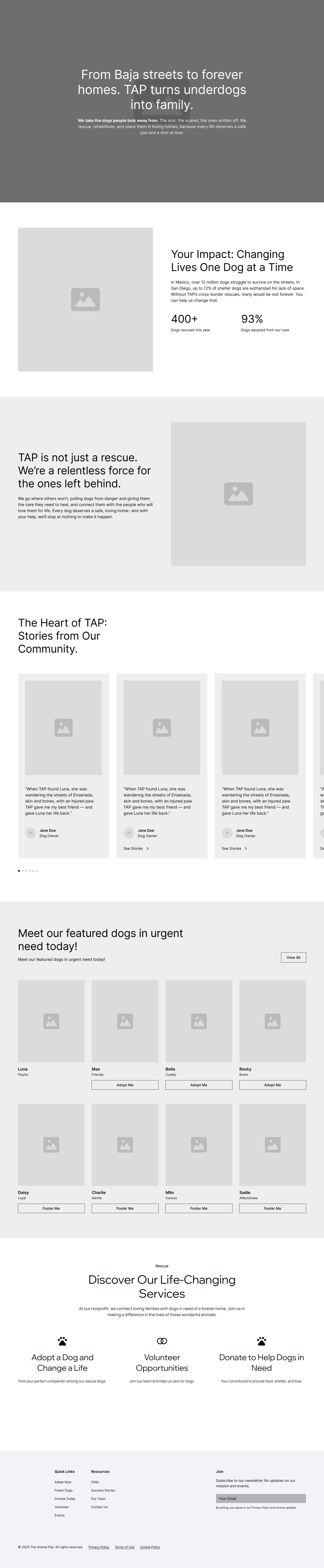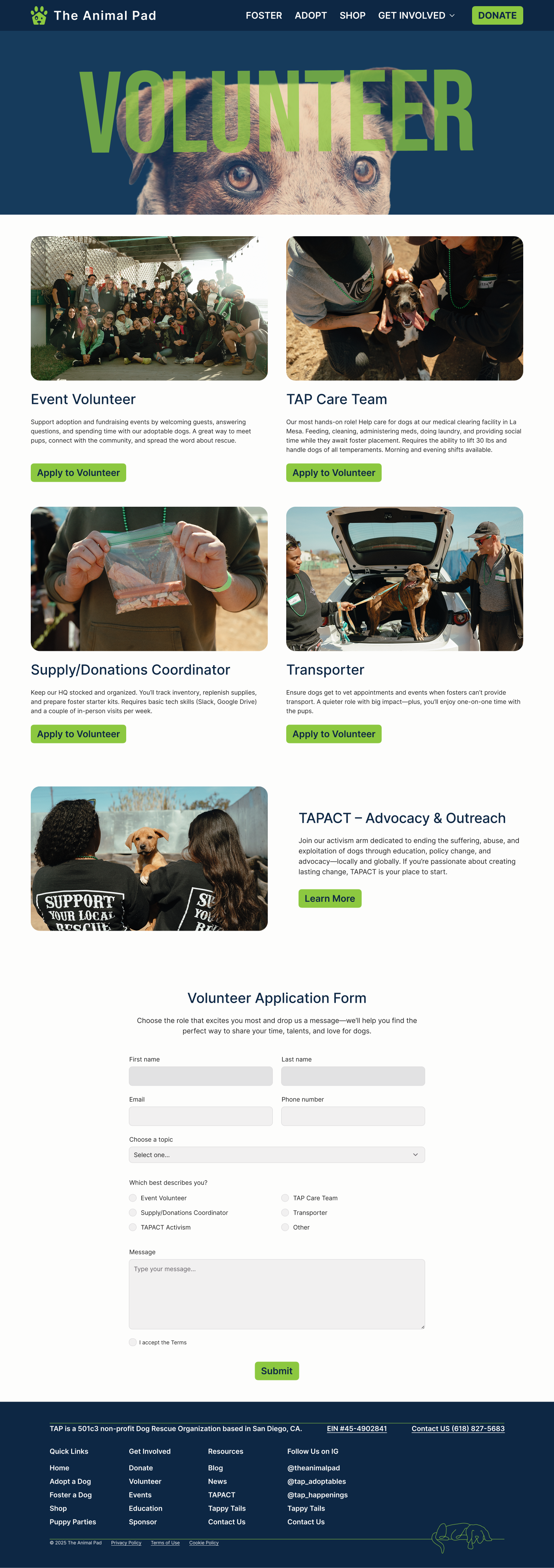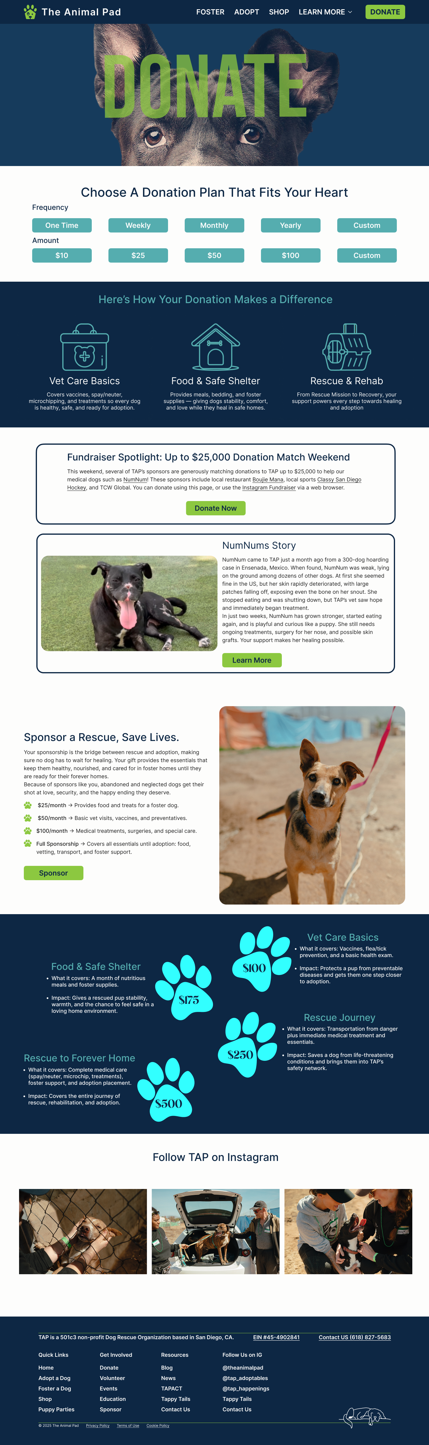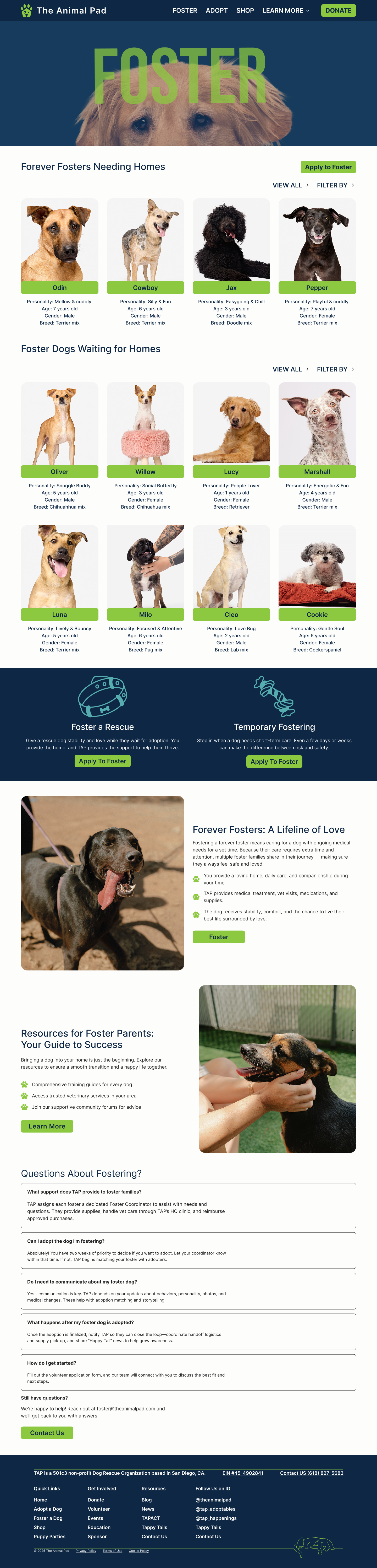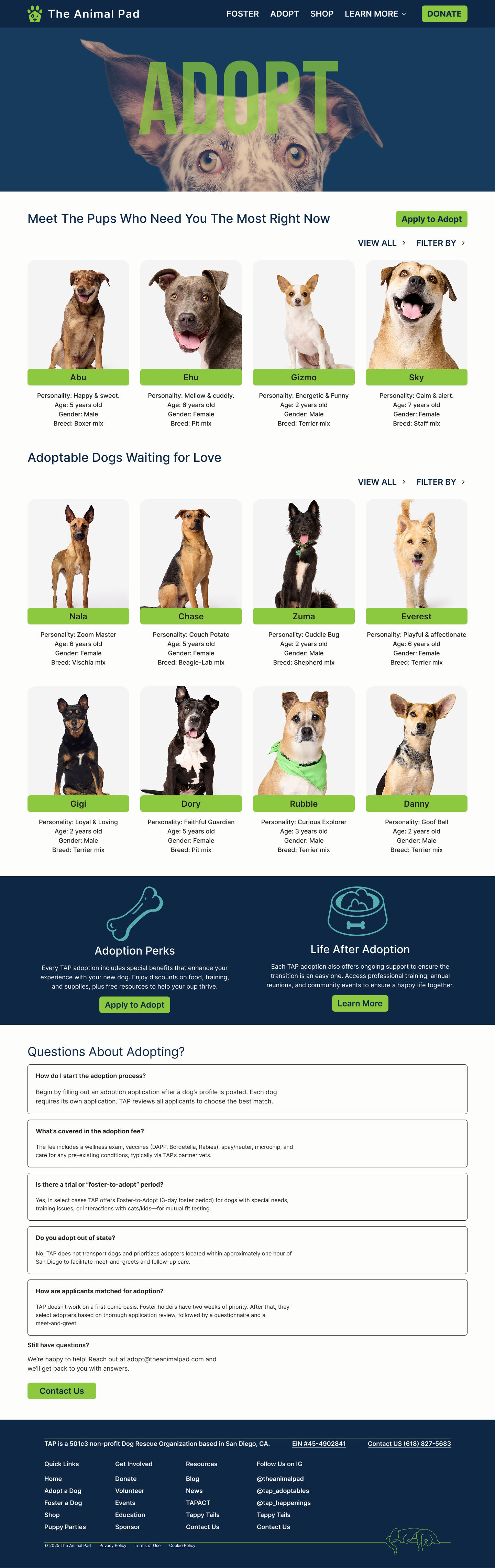How my team and I redesigned the website for The Animal Pad a volunteer run dog rescue in San Diego. Our goal was to redesign their website to make it easier for people to foster, adopt, and donate.