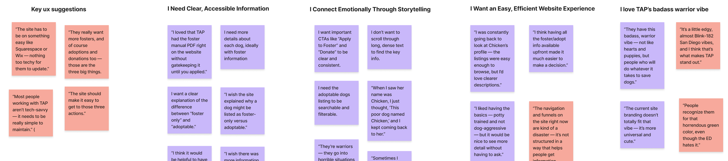 Users who want to foster, adopt, or donate struggle to complete their goals because key information is difficult to find, navigation is confusing, and the overall experience does not build trust. These usability issues prevent motivated users from taking action and limit The Animal Pad’s ability to support more dogs.