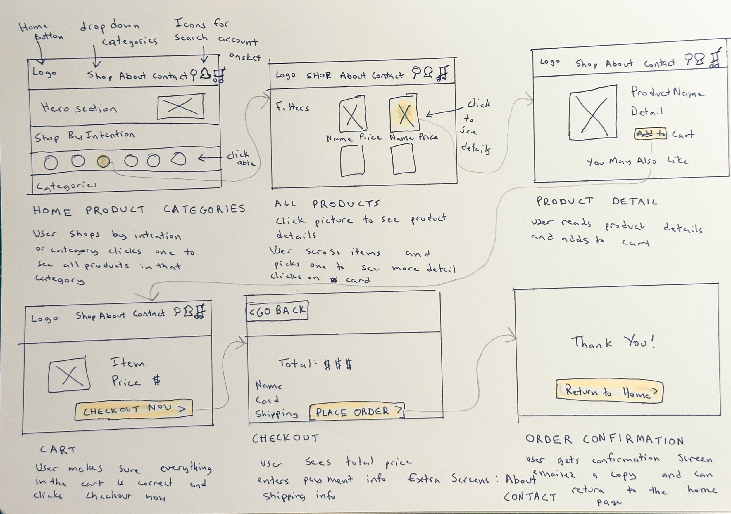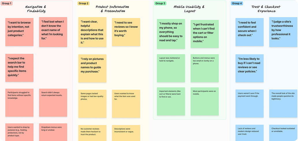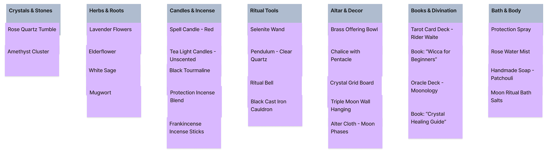 I began with a heuristic evaluation and competitive analysis of other small e-commerce metaphysical shops. Then, I conducted user interviews with people who frequently purchase crystals and candles online. Finally, I tested the original site’s usability to observe where participants struggled.