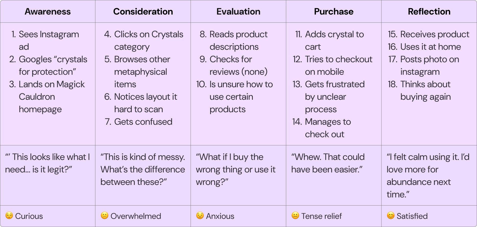 The user journey map illustrates how a first-time shopper discovers The Magick Cauldron, explores products, and navigates challenges before finally completing a purchase. The process revealed emotional highs and lows from curiosity and confusion to tension and eventual satisfaction highlighting where design improvements were most needed.